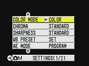 The S5 offers automatic exposure control, as well as a handful of manual adjustments. Through the LCD menu, the Manual menu option calls up a sub-menu of exposure options. An AE Mode setting lets you choose between Program mode and two individual aperture settings for aperture-priority metering, as well as a Long Exposure mode that offers two-, four-, and eight-second exposure times. However, in all other cases, shutter speed and aperture remain under automatic control. The S5's full shutter speed range extends from 1/2,000 to eight seconds, although the two-second and longer times are only available in Long Exposure mode. The S5 employs a Multi-Area Evaluation metering system by default, which divides the image area into sections to determine the best overall exposure. Through the LCD menu, Spot and Center-Weighted options are also available. You can adjust the overall exposure from -2 to +2 exposure equivalents (EV) in one-third-step increments, also through the LCD menu. ISO sensitivity options include 100, 200, and 400 equivalent settings to increase low-light shooting performance, with an Auto adjustment as well. White balance options include Auto, Daylight, Tungsten, Cloudy, Fluorescent, and Preset (manual setting). There's also a Color mode for capturing images in black-and-white or sepia tones, and Chroma and Sharpness adjustments. The camera's built-in, pop-up flash automatically releases when the camera is powered on (retracting only when the camera is powered off), and operates in either Auto, Red-Eye Reduction Auto, Fill-In, Flash-Off, Night Backdrop (slow-sync setting), or Red-Eye Reduction Forced modes. The Flash button cycles through each mode, and an icon appears on the LCD display indicating the selection.