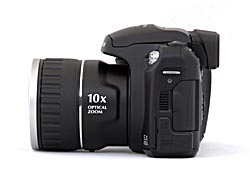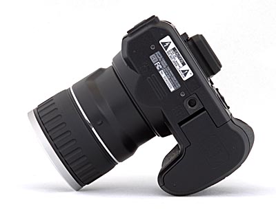 The front of the Fujifilm S5200 is attractive, with shiny silver highlights on a black matte body. The entire camera looks for all the world like a miniaturized SLR. Unlike the S5100, the lens does not protrude from the camera front, remaining inside the barrel. A plastic lens cap protects the lens from scratches when not in use, and tethers to the camera body and clips onto the neck strap to prevent it from being lost. Just inside the lip of the lens barrel, there are plastic filter threads. The lens shares the front panel with the autofocus assist illuminator and the self-timer lamp. With the pop-up flash released, the flash itself is visible. The good-sized handgrip on the left side of the front panel ensures a secure hold on the camera, and is substantial enough to be useful without detracting from the camera's portable size. Right of the lens is a small metal dome with holes for the microphone.