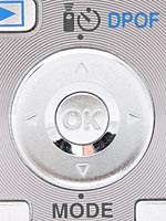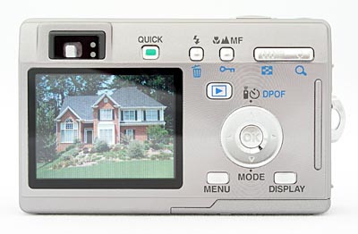 Only a handful of external controls dot the camera's rear panel, along with the optical viewfinder eyepiece and 1.8-inch color LCD monitor. Two LEDs next to the optical viewfinder report the camera's status, such as when focus is set, when the flash is charged, etc. A small five-way navigation controller is placed central between the LCD and right side of the camera, eliminating most of the thumb rest space. With it, the user navigates through settings menus, and accesses the camera's Mode menu via the down arrow. The up arrow accesses the Remote Control, Self-Timer, and DPOF functions. While shooting, the left and right arrows adjust EV compensation. The down arrow pulls up the Mode menu. Just below the controller are the Menu and Display buttons. Menu brings up and cancels the menu, while Display toggles through Default, Histogram, plain screen, and LCD off. Above left of the controller is the Playback button. When in Playback mode, another press here or on the Shutter button takes you very quickly back to Record mode. Just right of the optical viewfinder is the Green mode button. In this mode, the camera controls everything but the zoom. To the right of this are the Flash/Erase and Macro/Super Macro/Landscape/Manual Focus/AutoFocus Point/AF/Protect buttons (talk about your multi-function buttons). The Zoom lever is in the top right corner, controlling both Record and Playback mode zoom.