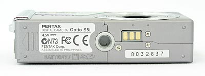 On the bottom panel of the Pentax S5i are the tripod mount, charging pads, and memory card / battery compartment. The plastic, threaded tripod mount is off-center from the lens because of the camera's small size, but provides a stable mount, centered along the panel. The memory card / battery compartment features a plastic sliding-release door, hinged with metal but too close to the tripod mount to allow quick battery changes while working from a tripod. However, I doubt that this will be of much concern to most users, as the Optio S5i is clearly designed for on-the-go shooting rather than tripod work.