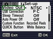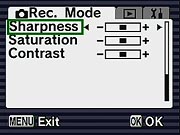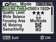 Program mode is the default operating mode, providing access to all of the camera's exposure options, such as Exposure Compensation, White Balance, metering, etc. You can also press the green Quick button on the back to enter Full Auto mode, in which the camera takes control of everything, including flash. The user only controls the zoom and shutter release in Green mode. By default, the Optio S5i uses a Multi-Segmented metering mode, which reads the entire image area to determine exposure. Through the Record menu, Center-Weighted and Spot options are also available. Exposure Compensation is adjustable from -2 to +2 exposure equivalents (EV) in one-third-step increments. An ISO adjustment offers an Auto setting, as well as 80, 100, 200, and 400 equivalent settings. White Balance options include Auto, Daylight, Cloudy, Shade, Tungsten, Neutral Fluorescent, Daylight Fluorescent, and Manual settings. The Optio S5i also features sharpness, saturation, and contrast adjustments, unusual features to find on a subcompact digicam model.