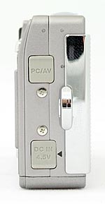 On the right side of the camera (when viewed from the back) are the DC In and dual-purpose PC/AV connector jacks, each protected by a flexible, rubbery flap that remains tethered to the camera. The metal eyelet for attaching the wrist strap is also on this side of the camera.