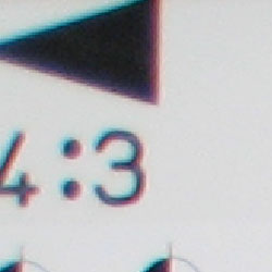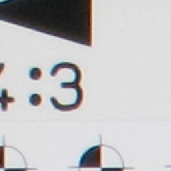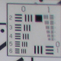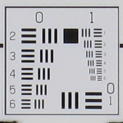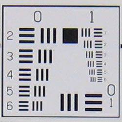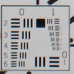 Chromatic aberration is noticable at wide angle, showing several pixels of medium coloration on either side of the target lines, but decreases to very low levels at telephoto focal lengths. (This distortion is visible as a colored fringe around the objects at the edges of the field of view on the resolution target.)