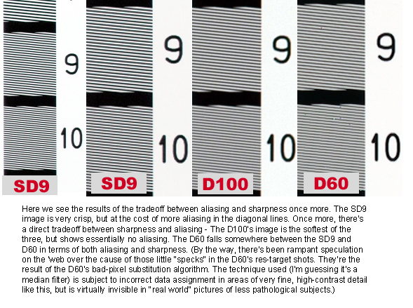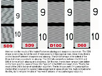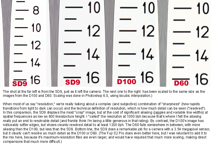 ISO-12233 (WG-18) Resolution Test Moderately good resolution, about 1,000 lines per picture height, before aliasing obscures detail. Resolution with the SD9 and its Foveon X3 image sensor is going to be a controversial issue. Foveon has claimed that the X3 technology provides twice the resolution of a conventional striped array, on a pixel-for-pixel basis. In the case of the SD9's 3.54 megapixel sensor, that would equate to resolution equivalent to that of a conventional 7 megapixel CCD or CMOS. In my testing though, I found that the SD9 resolved a bit less detail than competing cameras using six-megapixel sensors, although the difference wasn't dramatic. - Overall, impressive for a 3.54 megapixel array, but not quite up to the levels claimed by Foveon. "Resolution" is an area open to a lot of interpretation though. When most of us talk about "resolution," we're probably thinking in terms of how "sharp" an image looks. - And on that score, the SD9 does very well. Technically, "resolution" refers to how much detail a camera can see or "resolve," while sharpness more accurately describes how abruptly brightness values change across an edge. As you'll see in the image crops below, the SD9's X3 chip delivers very "crisp" or sharp images, but the resolvable detail isn't quite up to the levels delivered by competing cameras like the Canon D60, Fuji S2, or Nikon D100. (I included the D60 and D100 in the comparison, but deliberately left out the S2. (Which does slightly better than any of the three cameras compared.) - I didn't want to pry open the unequal-file-size can of worms any further than I already had in upsampling the SD9's image to match the size of those from the D60 and D100. The S2 really delivers its best performance with its interpolated 12-megapixel output file size, which would have required another level of interpolation.) This first shot above (click on the image to see the full-sized version) compares the horizontal-resolution component of the ISO12233 res target across the three cameras mentioned. More detailed text is attached to the image file. - Note the tradeoff between aliasing, "sharpness," and resolvable detail. This second shot shows another look at the sharpness/aliasing tradeoff. (I also divulge the explanation for the spurious dots that sometimes appear in D60 res-target images, but apparently rarely in "real world shots. ;-) As before, click on the thumbnail above to see the full-sized image. This is the point in these reviews where I usually report on optical distortion in a camera's lens. Since the SD9 uses interchangeable lenses, there's no point in talking about distortion here. - Other than perhaps to say that the professional-grade Sigma lenses seem to be both quite sharp and relatively distortion-free. Resolution Series