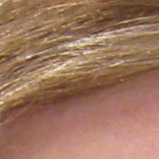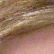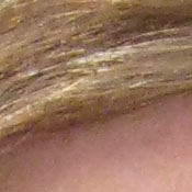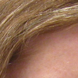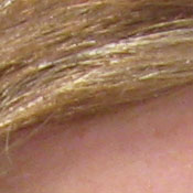 Noise-suppression systems in digital cameras tend to flatten-out detail in areas of subtle contrast. The effects can often be seen in shots of human hair, where the individual strands are lost and an almost "watercolor" look appears. The crop at far right shows this somewhat, with both darker and lighter areas of Marti's hair showing limited, blurry detail; though individual strands are visible where a lighted strand passes in front of a darker shadow area. On balance, the SD900 shows less detail loss to noise reduction at low ISO settings than average, but more at high ISOs. This 10 megapixel sensor is relatively noisy, so noise suppression is expected.