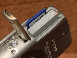 There are a couple of things to note (or quibble about) with the PowerShot SD950 IS's design. One is that the standoffs on the short end are a bit narrow, so the camera easily wobbles on an uneven surface (like bricks). Good thing the shell is tough titanium. Another is that the Canon 950 IS's chrome rubber door on the USB port really doesn't open far enough to let you connect a USB cable. You have to insist.