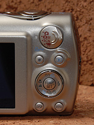The PowerShot SD950 IS's Display button has been moved down, joining the Menu button just under the Touch control dial. Above the Touch control dial, the new Playback button joins the Share/Print button.