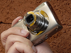 It isn't the lightest ultracompact around, but we like a little heft in a little camera. It helps stabilize the PowerShot SD950 IS as you press the Shutter button.