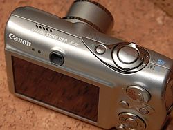 The Canon PowerShot SD950 IS's shell is curved a bit differently, particularly at the base, and the back gained one more button when Playback mode moved off the Mode dial onto a button of its own. Why? So you can program it to switch into Playback (the default), run a slide show, or record a voice memo. The latter two are really temporary conveniences (full-time they're more inconvenient). But I did observe to my delight that the Playback button will actually turn the camera off as well as power it on. Genius at work, there.