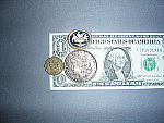 Resolution is high, with good detail in the dollar bill, coins, and brooch.