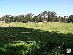 But I did spy one on the side of a hill about 300 yards away. I got as close as I could. There was a chain link fence between us. I slipped the Olympus SP-550 UZ's lens carefully between the links and took a wide angle shot just to set the scene. There's no way you can tell there's a buffalo in that picture.