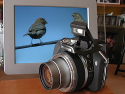 Front View. The camera is actually off with the lens tucked away waiting for the lens cap. Behind it in this series of shots is the Pandigital photo frame showing off images taken with the camera directly from its xD card.