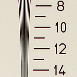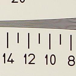 Chromatic aberration is moderate, showing about 4-6 pixels of moderately bright coloration on either side of the target lines at the wide angle lens setting. (This distortion is visible as a very slight colored fringe around the objects at the edges of the field of view on the resolution target.) However, at telephoto, chromatic aberration is very low.