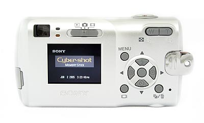 The Sony S40's rear panel has the remaining camera controls and function buttons, along with a 1.5-inch color LCD monitor for previewing and playing back images, and the optical viewfinder window. The S40's LCD is very readable in bright light, even direct sunlight, due to a special anti-glare coating. Above the LCD is a sliding switch for selecting among Playback, Record, and Movie modes. The LCD display reports a variety of camera and exposure settings, including the aperture and shutter speed settings (a nice bonus for those interested in how the camera will expose the image) and a three-stage battery gauge. The optical viewfinder is located above the left corner of the LCD monitor, and has two LED lamps along the right edge of the window, each of which reports the current status of various camera functions. The optical viewfinder has no dioptric adjustment, but eyeglass wearers will be pleased with the high "eyepoint," allowing enough room for an eyeglass lens between the camera body and your eye. The camera's Zoom control is in the upper right corner. Lower right of the LCD is a Five-way Arrow pad, with small arrows pointing in four directions (Up, Down, Left, and Right) and a set button in the middle. Each serves multiple functions, navigating onscreen menus scrolling between captured images in playback mode, or activating different camera functions (Flash, Self-Timer, Quick Review, and Spot metering mode).