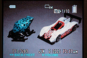In playback mode, the default image display shows the most recently captured image, with a modest information overlay present. Pressing the display button once adds the exposure information and a small histogram to the overlay, pressing it again removes the information overlay entirely, and pressing it a third time turns the LCD off altogether. Pressing the wide-angle side of the zoom lever takes you to a display showing images on the Memory Stick or internal memory in groups of nine small thumbnails. (You can navigate a yellow outline cursor over these thumbnails by using the four arrow keys. Pressing the OK button will bring the currently-selected image up full-screen.) Pressing the telephoto side of the zoom lever when viewing an image full-size on the LCD screen will zoom in on the image, in 17 variable-sized increments up to a maximum magnification of 5x.