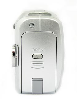 The right side of the camera (as viewed from the rear) has a large battery door that opens by pressing a gray button in the middle and sliding the entire door down. It then swings out to the right. The door has another soft plastic door that opens to reveal a small opening into the battery compartment, which accommodates the AC adapter cord. Also on this side is the eyelet for attaching the wrist strap.