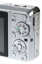 Look and feel. Though trim and compact, the Sony Cyber-shot DSC-S750 was comfortable to hold in my medium-sized hands. Likewise, one-handed shooting was also easy to manage, though I did notice a tendency for my thumb to slide over (and thus smudge) the LCD monitor. The lack of a thumb rest on the rear panel means your thumb has to rest on the Zoom lever or Mode dial most of the time. This typically wasn't a problem, as the Mode dial wasn't easily turned, and the Zoom lever was just firm enough that it wasn't accidentally pressed either. On the upside, all of the Sony S750's external controls are clustered along the right side of the rear panel, which makes one-handed shooting less of a problem.