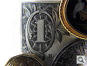 Macro: The Canon PowerShot SX30's Macro mode captures fairly sharp details in the dollar bill, though the brooch and coins are somewhat soft. Blurring is noticeable in the corners of the frame, as is some chromatic aberration, which is a common limitation among consumer digital cameras in macro mode. Exposure is also quite uneven at this close range, with strong overexposure along the left side. Minimum coverage area is 1.69 x 1.27 inches (43 x 32mm), which is quite good. The camera focuses so closely that the flash is almost completely blocked by the lens.