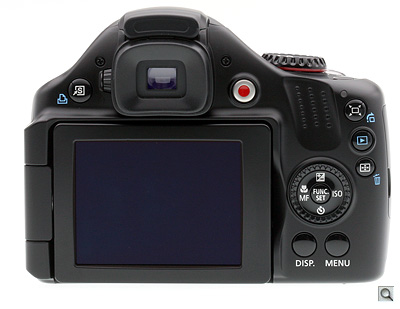 The rear of the Canon SX30 IS has an electronic viewfinder (202K dots) with diopter control and a 2.7-inch vari-angle LCD screen with 230K dots. This type of monitor lets you hold the Canon SX30 IS at interesting angles such as over your head or at waist level. The EVF is surrounded by a rubber gasket which makes it comfortable to use--and you'll need it, take our word for it.