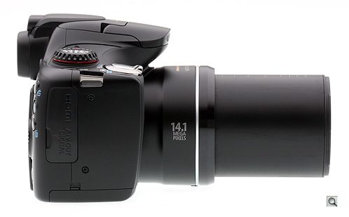 The all-black Canon SX30 IS is one of the better-looking Mega-Zooms with an attractive, muted finish. It's not festooned with decals galore, but elegant in its way. As you'd imagine, the 35x lens takes up the front, and like most cameras of this type, you attach the lens cover with a string to the strap. This looks a bit low-tech to me, and I like putting the cap in my pocket. The lens accepts 67mm diameter filters with an optional adapter (Canon part number FA-DC67A), and there's also an optional lens hood available (LH-DC60). The only other items on the front of the Canon SX30 IS besides a few subtle logos are the AF Assist/self-timer lamp and two stereo mics under the flash. Stereo sound is a big plus compared to some competing models. Overall the Canon SX30 IS measures 4.8 x 3.6 x 4.2 (122.9 x 92.4 x 107.7mm) and weighs 21.7 ounces fully loaded (615g).