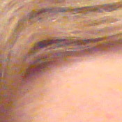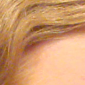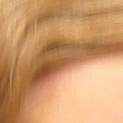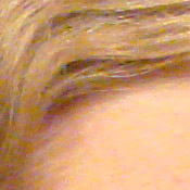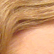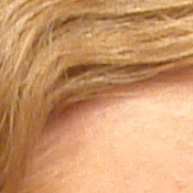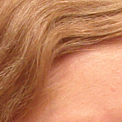 Noise-suppression systems in digital cameras tend to flatten-out detail in areas of subtle contrast. The effects can often be seen in shots of human hair, where the individual strands are lost and an almost "watercolor" look appears. The crop at far right shows this in the darkest areas of Marti's hair, which do show limited detail. That said, there are a few individual strands still visible in the darker midtones.
