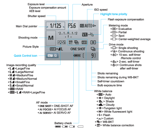 Let's take a closer look at the Canon T1i's rear-panel display: The image below shows callouts for all the information shown in the default display. (Illustration courtesy Canon USA.)