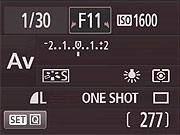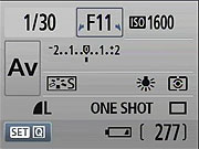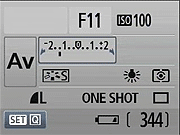 Whatever exposure parameter is currently being controlled by the Canon T1i's Main Dial is highlighted with arrows in the corners of its box, to indicate that it can be changed by rotating the dial. Here, we're adjusting the exposure compensation, marked by the outlined box. Note the arrows. (They're pretty subtle; we would have liked to see them a bit more prominent.)