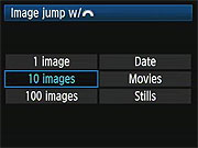 The Canon T1i handles "jumping" through images differently from the XSi. On the XSi, you'd press the JUMP button to switch between options of 1, 10, or 100 images for scrolling through the images on a card. On the Canon T1i, rapid scrolling through images is accomplished via the Main Dial (on the camera's top panel), and an option on the Playback menu sets options of jumping through images 1, 10, or 100 images at a time, or on jumping between shots captured on different dates, between groups of movies, or groups of still shots.