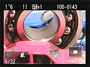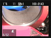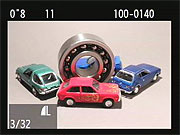 If you press the Zoom Out button while viewing a single image on the LCD screen, it'll take you first to a 4-image thumbnail display, and then to a 9-image one, if you press it once again. The arrow keys let you navigate among the thumbnail images. The text above the thumbnails displays the same basic exposure info for the currently-selected image as does the default single-image display. Pressing the DISP button in this mode overlays the image size/quality and file number for the currently selected image, as in normal playback mode. |