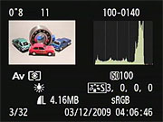 Like the Rebel XSi, the Canon T1i shows each image as it's captured, though you can turn off this function through the Camera menu. The display mode in Record Review defaults to the same as was last used in Playback mode, or you can hit the DISP button to cycle to a different mode. Likewise, in Playback mode, you can cycle between the available display options by pressing the Canon T1i's DISP button repeatedly. (Display mode selection is persistent across both record and playback modes, no matter which mode you make the selection in.) You can also select between the normal luminance-based histogram and the RGB histogram option via a Playback-mode menu item. The screenshots below show the various displays and options available.