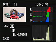 This is the default display in playback mode. The file number is displayed upper right, the shutter speed and aperture in the upper left, and file sequence number and quality are shown below left. |