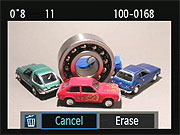 Pressing the Delete button brings up this display, giving you the option to erase the current image, or cancel out of the delete option. The Delete display will show either the full image or a thumbnail plus histogram, depending on the playback mode you've selected. In thumbnail display mode, the current thumbnail is highlighted, but won't be shown full-screen. |