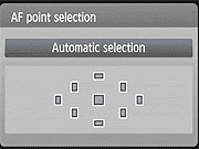 The AF-point selection screen is also very clear and straightforward. When you press the AF-point selection button in the upper right corner of the back panel, the display shown above appears. The arrow keys let you select one of the available points manually, while the Canon T1i's SET button selects the center point. With the center point already selected, the SET button toggles between Manual and Auto AF point selection. Lightly pressing the Canon T1i's shutter button returns you to the main shooting display.