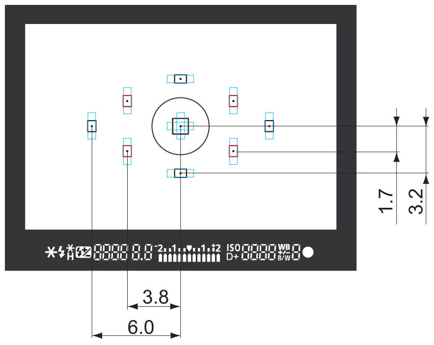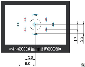 The AF points on the Canon T1i cover about 60% of the frame width, and about 50% of the frame height. The illustration above shows the relative spacing between the various AF points, with the distances between them marked in millimeters, at the focal plane. (Illustration courtesy Canon USA.)