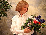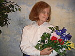 - Color: Red skin tones, dark colors in bouquet.