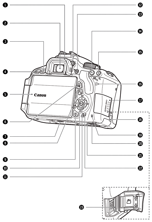 Moving to the rear of the Canon T3i, the changes are at their most obvious. As mentioned earlier, the T3i now has an articulated LCD, specifically a side-mounted tilt/swivel type. Fitting in the mechanism while keeping the increase in size and weight to a minimum has necessitated some repositioning of the controls, although in general the layout is very similar to that used previously. There's a new Info button, taking up the location previously occupied by the Display button that's now located on the top panel. The shape of this and the Menu buttons have been changed, and they've moved a little higher up the camera's top left corner.
