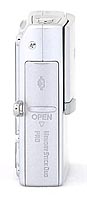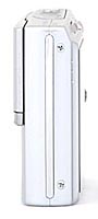 The right side of the Sony T9 features a small eyelet for attaching the wrist strap and the battery / media compartment. The shiny silver door slides down before opening outward, and reveals the battery and Memory Stick Duo slot.