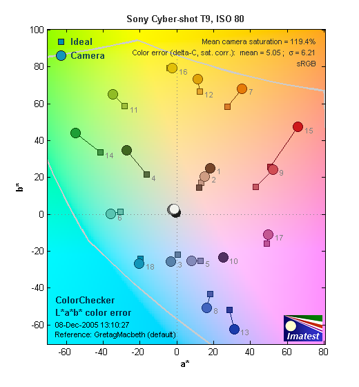 The other important part of color rendition is hue accuracy. Hue is "what color" the color is. Here, the Sony DSC-T9 performed quite well, producing almost perfect hue accuracy across the entire spectrum.