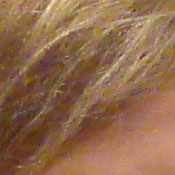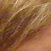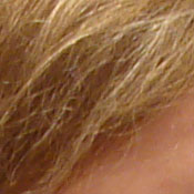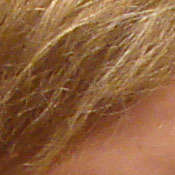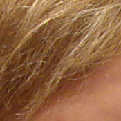 Noise-suppression systems in digital cameras tend to flatten-out detail in areas of subtle contrast. The effects can often be seen in shots of human hair, where the individual strands are lost and an almost "watercolor" look appears. The crop above right shows this, with darker areas of Marti's hair showing only limited detail, even though individual lighter strands are quite visible against darker background areas in the uncropped image. (The level of detail loss shown here isn't at all obvious on prints 8x10 inches or smaller though.)