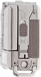 The bottom has the final items: A metal tripod socket, a very fragile-feeling battery door, and a difficult-to-remove rubber port cover. The latter conceals an A/V Out jack, a Component out port, and a USB port.