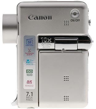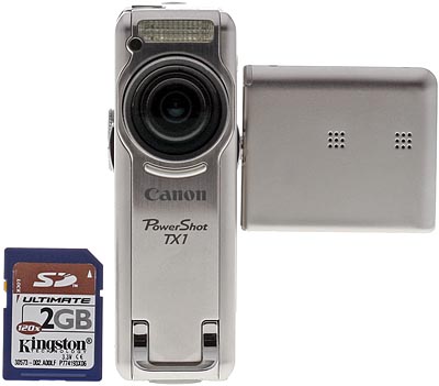 Built almost entirely of stainless steel, the Canon TX1 is a hefty, rectangular digital camera. All resemblance to the Digital ELPH line disappears there, however. It's built more like a camcorder placed on its back. The 10x zoom lens deploys from behind a sliding metal door, the 1.8 inch screen swivels up from the side like a bird wing, and most of the important controls are on the back toward the top half of the TX1. Its unique shape has no grip, because the camera is the grip, fitting completely into and quite filling your hand. Measuring only 3.5 x 2.36 x 1.14 inches (88.8 x 59.9 x 29mm), it's a little thick for a pocket, but does go well into cargo pant and jacket pockets. Its 8.5 ounces (241 grams) gives it the proper density for a better hold when shooting movies or stills. Shooting vertical images is a little awkward with the Canon TX1, and we recommend attaching and using the included wrist strap to guard against accidental drops. Whether you find using the Canon TX1 easy or difficult to use depends heavily on finger length and hand size. Big thumbs will not like the TX1's rear controls, and neither will short fingers be able to reach the shutter button; but long fingers will have a tough time staying away from the lens.