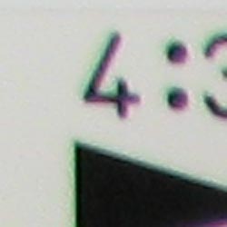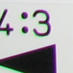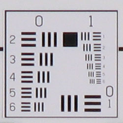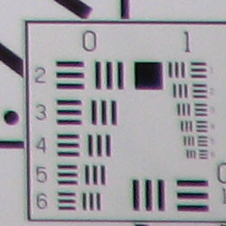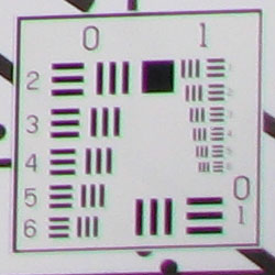 Chromatic aberration was moderately high at wide angle, showing about 6-7 pixels of bright coloration on either side of the target lines. (This distortion is visible as a very slight colored fringe around the objects at the edges of the field of view on the resolution target.) At full telephoto, chromatic aberration was also high, but not quite as bright. Overall, the effect is noticeable in a few of our test shots.