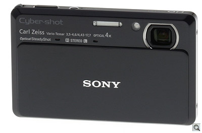 A sliding lens cover adds to the camera's stylish design but the combination of a slick surface and the stiffness of the sliding mechanism makes opening the cover a little difficult. The good news is that it won't slide open accidentally and run the battery down while sitting unused. I found it's best to either push the top edge of the cover down with my right thumb or place my right forefinger on the etched Sony name to achieve enough leverage to slide the cover open.