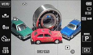 Other icons that appear on the LCD include: Battery Gauge, number of shots remaining, resolution/aspect ratio, Mode, Playback arrow and Menu icon.