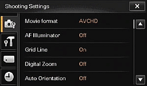 Where things get a little less intuitive, at least for this reviewer, is drilling down into the menus. When the main Menu is open, there's a mysterious Shooting Settings icon (it looks like a miniature suitcase to me) that is likely to be overlooked. Don't ignore it, though. That's where you' can change the movie format (but not other movie settings -- more about that in a minute) and turn a number of options on or off, including the AF Illuminator, Grid Line, Digital Zoom, Auto Orientation, the helpful Scene Recognition Guide, Red Eye Reduction, Beep Alert and more. Set-up options include LCD Brightness, Language and Power Save, to name just a few. A Memory Card Tools section covers formatting, creating, folders, copying images, etc.