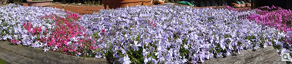 Sweep Panorama is really easy to use, once you figure out the speed with which you have to pan. If you're moving too slowly, for example, you'll get a message that the camera can't capture the image. There weren't any people around to test out the Intelligent Sweep Panorama's Face Detection once the weather got warmer and spring temperatures brought out the flowers. A long, narrow expanse of blooming Phlox seemed like a good subject for a Spring iSweep Panorama shot. Wrong. Because the flowers are uniform in size, shape and grouped by color, and because I was so close, the camera had a hard time meshing the images together. Some parts of the panorama looked great but others were misaligned and I could actually see the individual frames. All the other non-Phlox panoramas I shot were perfectly aligned and one shot with a moving car in the background looked natural and not split between frames, indicating that given the right circumstances, the intelligent part of the Sweep was pretty smart.