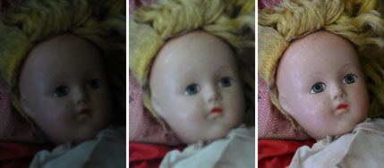 The third attempt was to use the Panasonic TZ1's Hi Sensitivity Scene mode. Wow. I shoot the dolls with every stabilized camera I review now, and I've never seen the eyelashes that sharp (except on a fancy dSLR). And the color was accurate, and excellent (I kind of wish Panasonic restored dolls). The camera used f/4.0 again but a faster shutter speed of 1/15 second. And ISO was 1,600. There's certainly a lot of processing going on (there's a lack of detail in the hair, and the blouse) but you happily pay that price to get the shot.