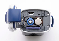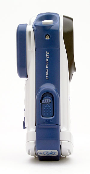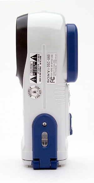 The DSC-U60's bottom panel has one flat, angled surface for resting the camera on end, and then a second half that curves slightly toward the other side. The entire bottom panel is the door for the memory and battery compartment, with a large hinge on one end. Inside the compartment door, an O ring creates a watertight seal. A second door inside the compartment covers the Memory Stick and AAA battery slots. The USB connection terminal is adjacent to the inner door.