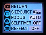 Though the camera controls exposure and white balance, the Record menu offers an entertaining Picture Effects setting. You can record images in black and white or sepia monochrome, or select the Solarize or Negative Art options for unusual effects. The DSC-U60's flash operates in Forced, Suppressed, Auto, and Red-Eye Reduction modes. Sony estimates the flash as effective to about 6.2 feet (1.9 meters), a fairly short range, but one that's consistent with its wide-angle lens. A Burst mode captures five successive images at the 640 x 480-pixel resolution while the Shutter button is held down, at approximately 0.5-second intervals. (Note though, that if your Memory Stick is nearly full, the actual number of images recorded may be limited by the remaining storage space, and frame rates may vary depending on the shooting mode. Burst mode intervals will be slightly longer due to the slower shutter speeds in Illumination Snap and Twilight modes.)