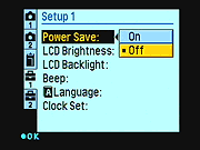 Setup Mode: This mode lets you change a variety of camera settings. The Setup menu is displayed immediately upon entering the mode. Five separate screens of options are available, selected via a tabbed interface running down the left hand side of the screen.
